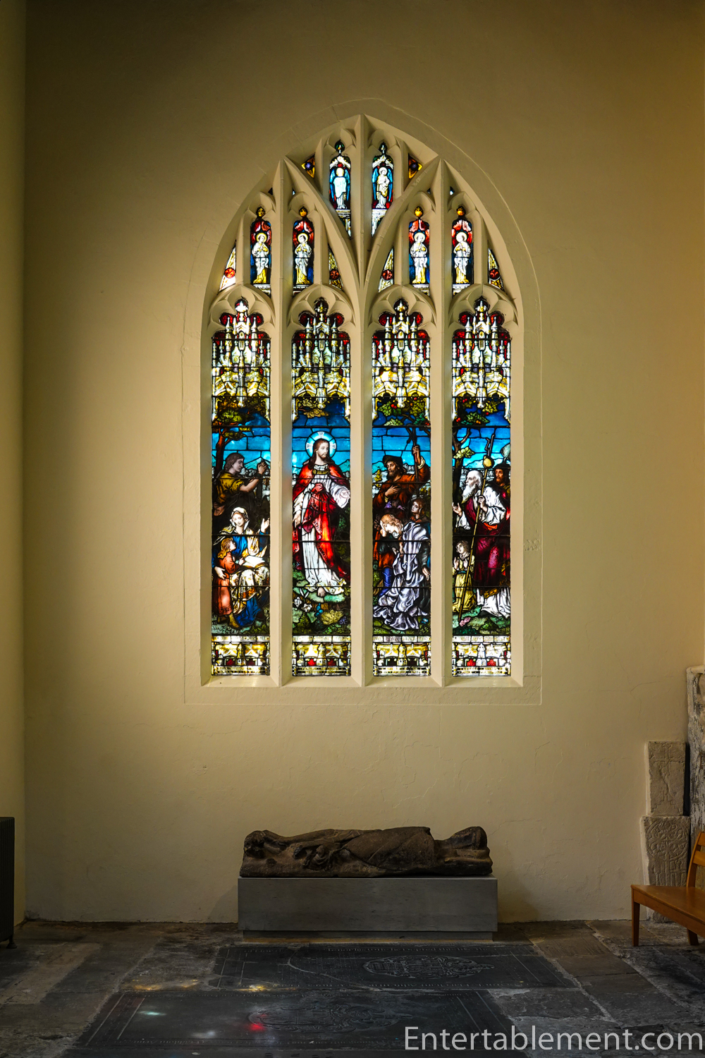 He’s positioned beneath this stained glass window.