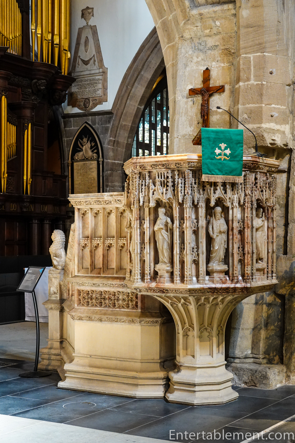 The Victorian alabaster pulpit was carved by sculptor Robert Beall and designed by architect Robert Johnson in 1882.
