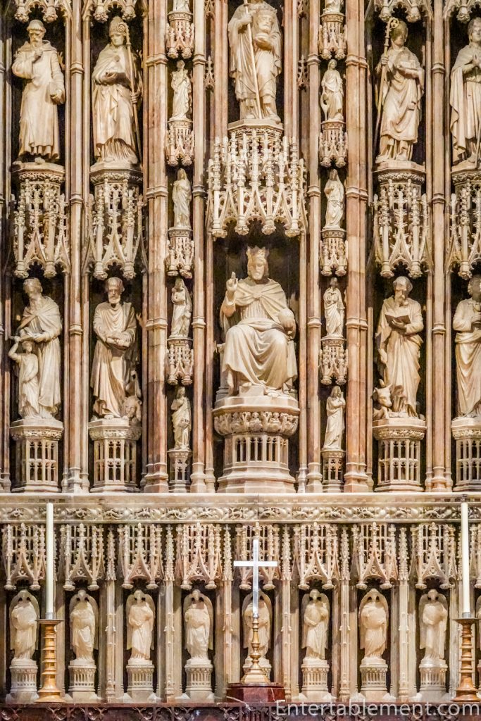 The two sedilia—seats for clergy, set at right angles to the reredos—are capped with intricately carved ogee arches.