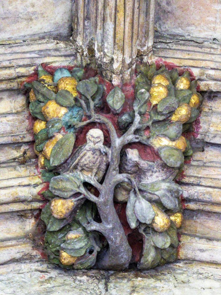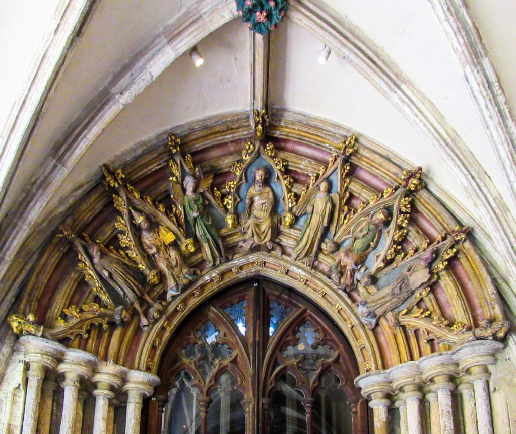 The cloisters also contain the Prior’s Door, where seven colourful figures perch above a pointed arch—Christ in the centre flanked by Moses, St John the Baptist, St Edmund and attendant angels.