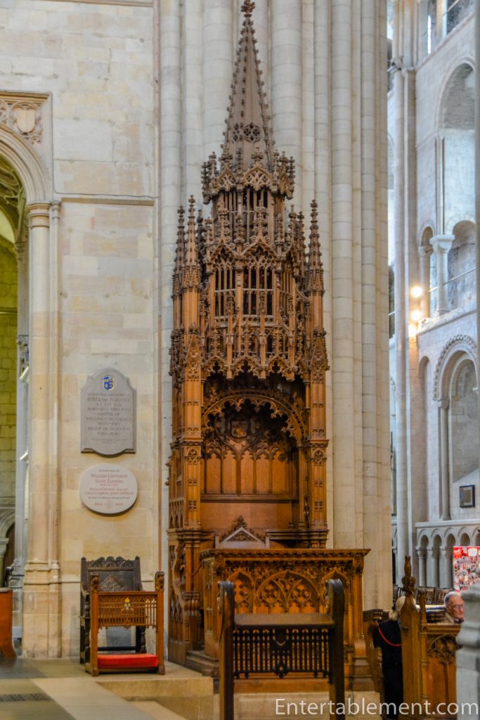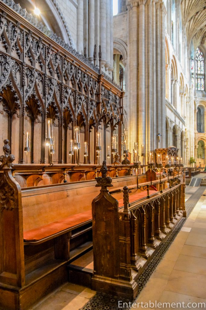 The canopies above the choir stalls are original, from the 15th century. The stalls themselves were designed by J. L. Pearson and installed in the 19th century as part of the Victorian restoration. They’re slightly paler in colour than the original wood.