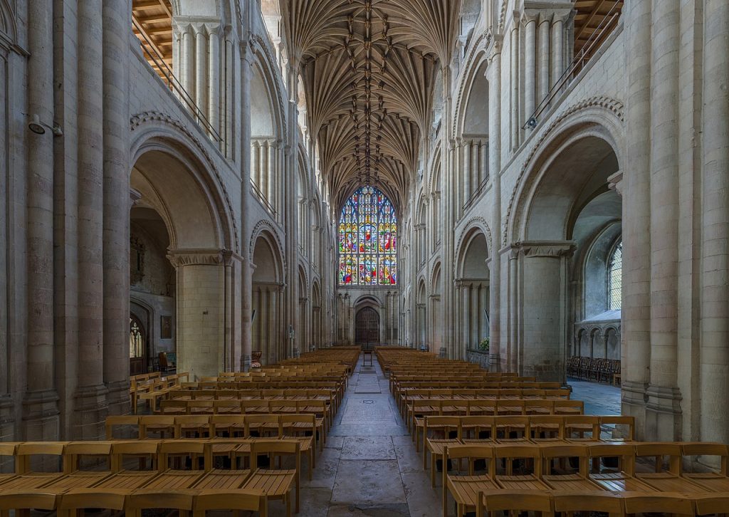 Begun in 1109 and completed around 1145, Norwich Cathedral was built all of a piece. And with ample funds available, it avoided subsequent eastern additions containing saintly relics to attract pilgrims—a coffer-swelling attraction routinely employed by cathedrals less fortunately endowed.