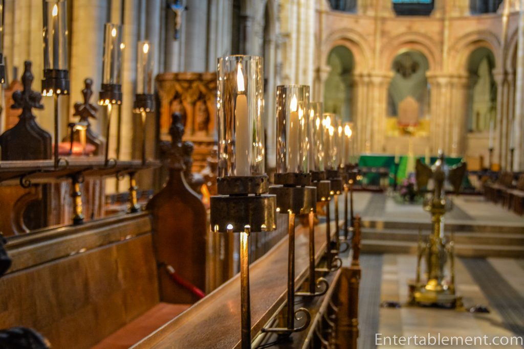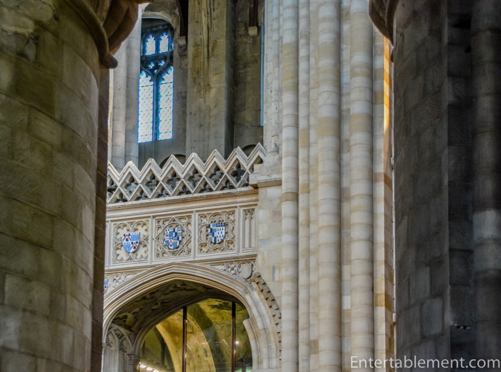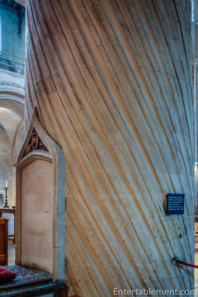 After the calm uniformity of the soaring pillars in the nave, it’s a bit startling to encounter the stubby twist-pattern Norman pillars flanking the Sanctuary. They’re massive.