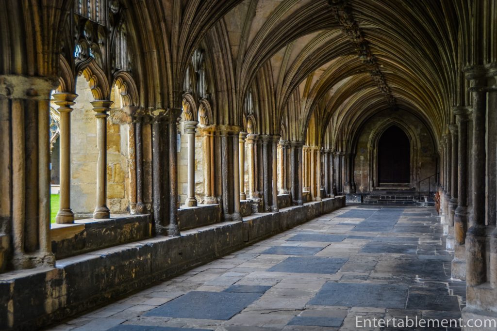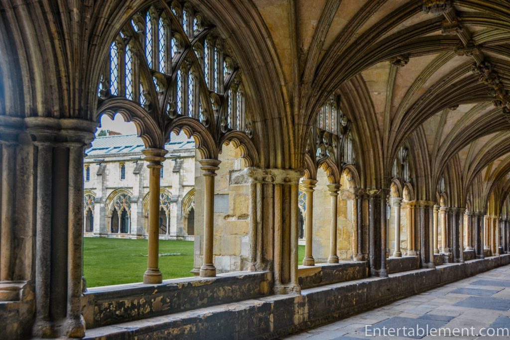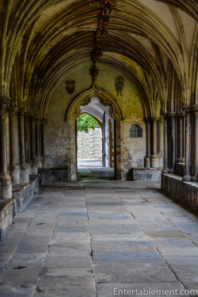 Let’s head out now to the cloisters, remarkable for their size (second only to Salisbury) and their excellent state of preservation. Note that they have two storeys, the only such example in England. They were built over an extended period, beginning in 1297 and finally finished in 1430.
