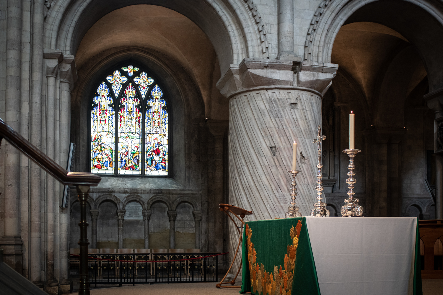 After the calm uniformity of the soaring pillars in the nave, it’s a bit startling to encounter the stubby twist-pattern Norman pillars flanking the Sanctuary. They’re massive.