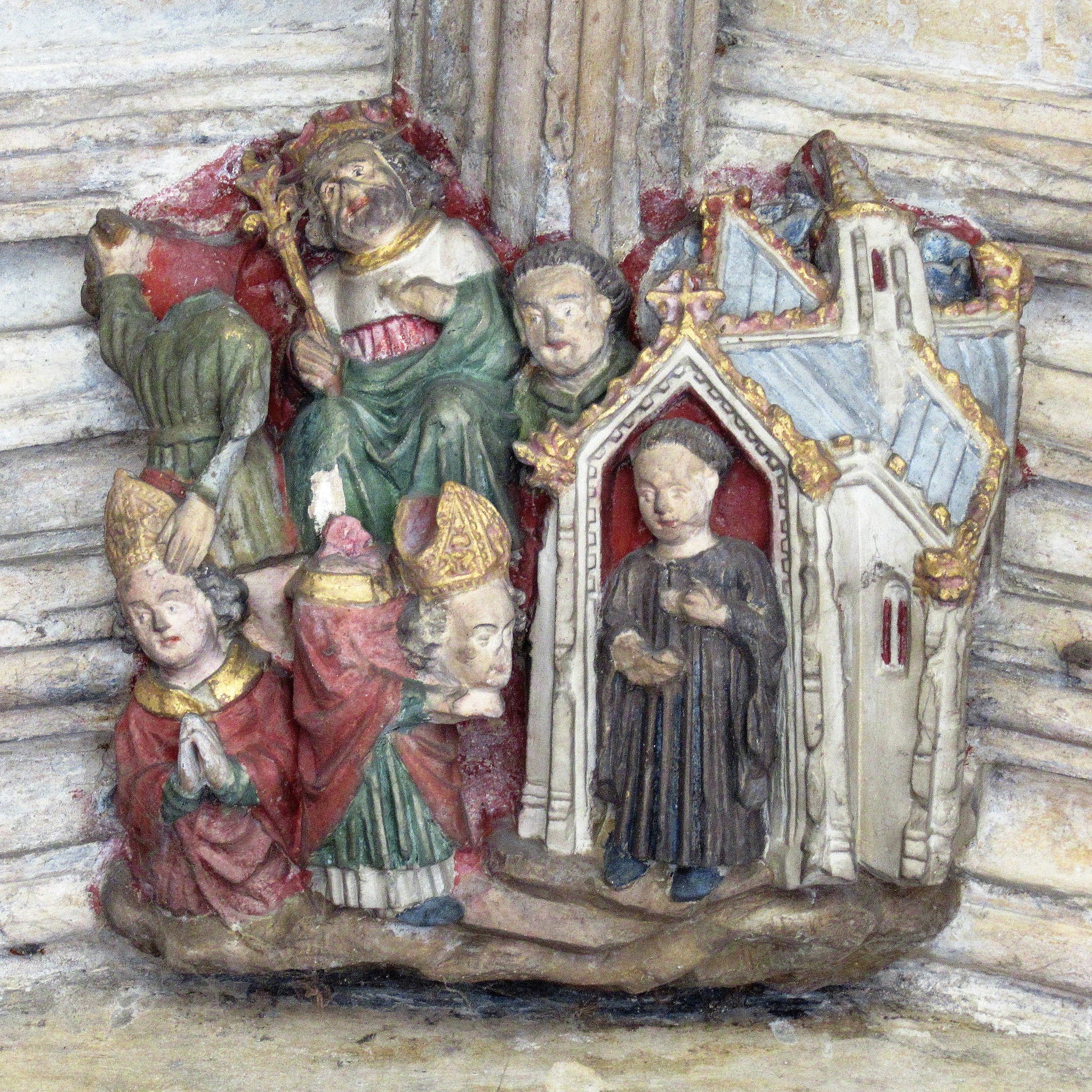 The cloisters also contain the Prior’s Door, where seven colourful figures perch above a pointed arch—Christ in the centre flanked by Moses, St John the Baptist, St Edmund and attendant angels.