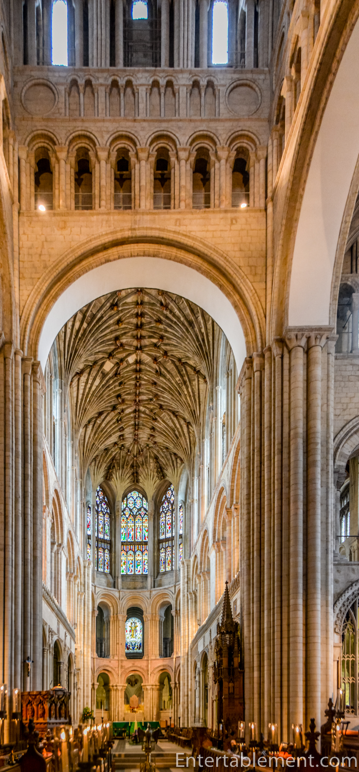 Lavish he certainly was. Bishop Losinga ensured that Norwich’s fourteen-bay nave exceeded Canterbury’s in length—it’s almost as long as Winchester’s. But it sure is pretty! Graceful pier shafts (ribbed columns) soar from ground to vault without interruption.