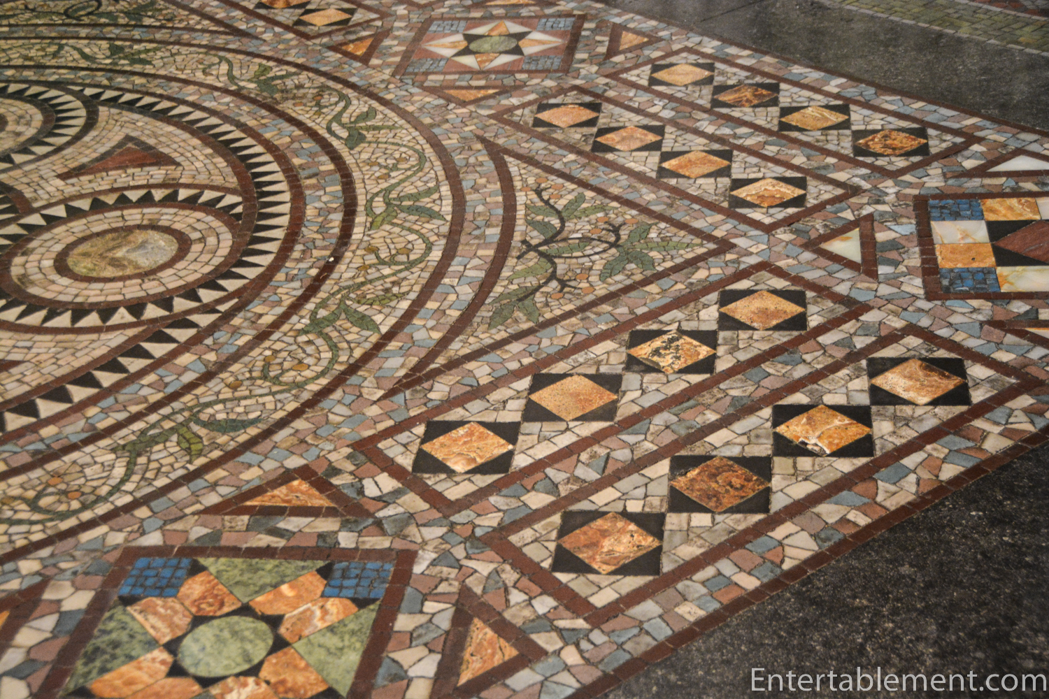 The marble mosaic tile floor of the Sanctuary is vividly coloured.