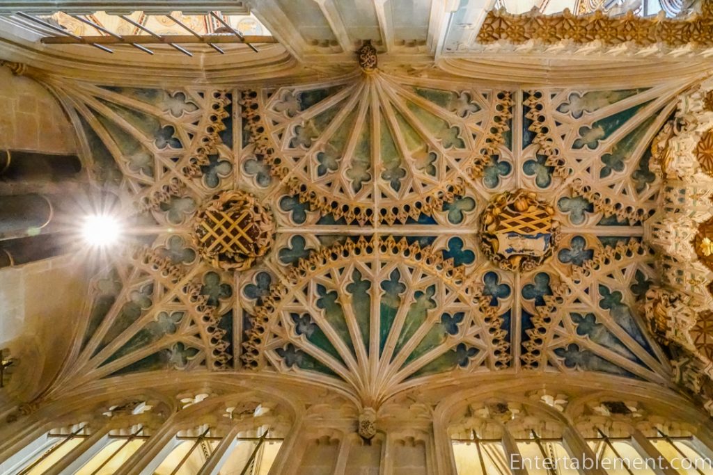 I lay on the floor inside to get a shot of the fan-vaulted ceiling, with its painted and gilded roses and pomegranates, emblems of Henry VIII and his first wife, Catherine of Aragon.