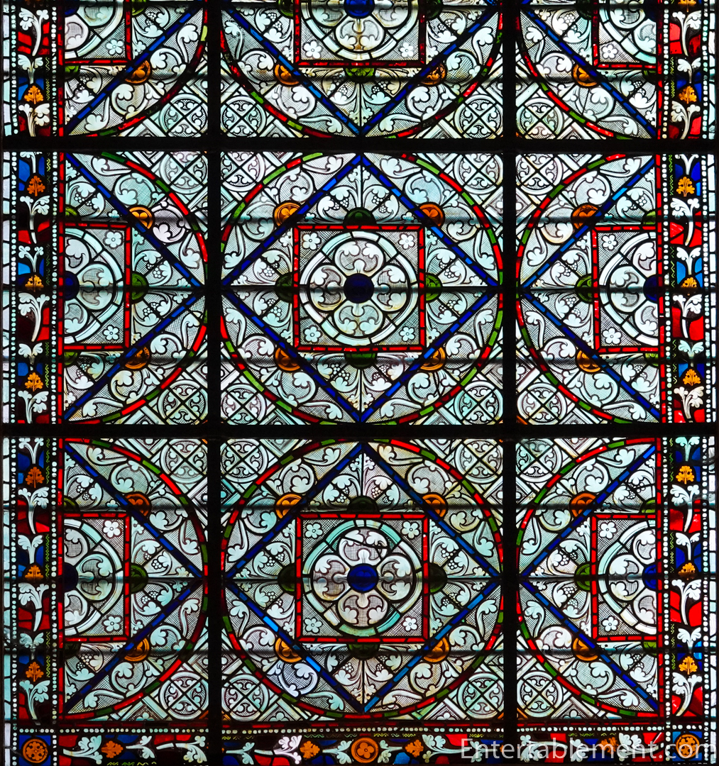 The stained glass is a Victorian replica of the medieval Grisaille glass, reminiscent of much more modern patterns of Arts & Crafts artist William Morris.