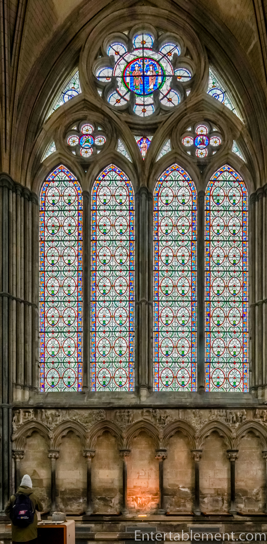 Behind the main altar is the retrochoir, in which one of Salisbury’s few lapses of taste is evident. Yes – that window.