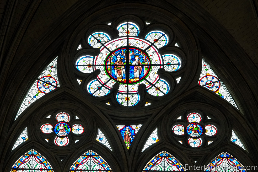 The 1980s were a lousy period for fashion and architecture. Gabriel and Jacques Loire were the glass artists who rendered “prisoners of conscience”. People stare dejectedly outward from the prison of blue glass, making the entire area broodingly dark. Yuck.