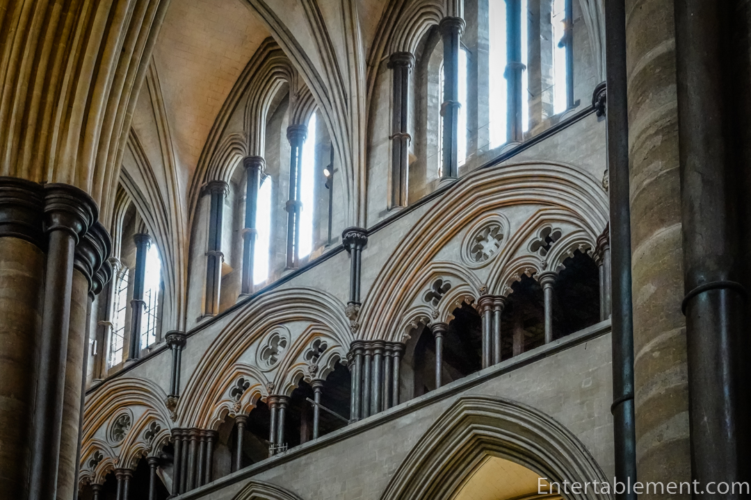 Salisbury conducts tours up the 332 steps of the tower, and I would have loved to participate, but I’m somewhat claustrophobic and tight staircases are the worst. I’ve had to breathe myself out of a meltdown on more than one occasion when my eagerness to explore a tower has triumphed over good sense. Having left Himself at the pub, my eyes in the sky were unavailable. Thankfully, I came across this photo—thank you, Jack Pease, who generously shared his shot on Flicker and allowed sharing! Look at the precision of the grey Purbeck marble columns in the triforium (middle layer) and the perfectly level top of the arcade (bottom level of arches).