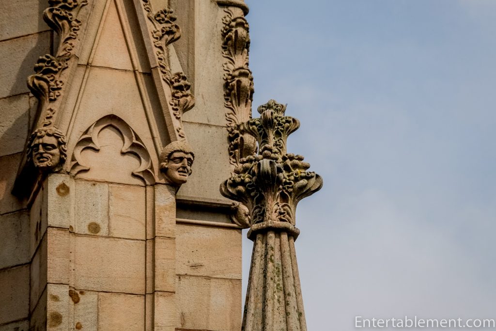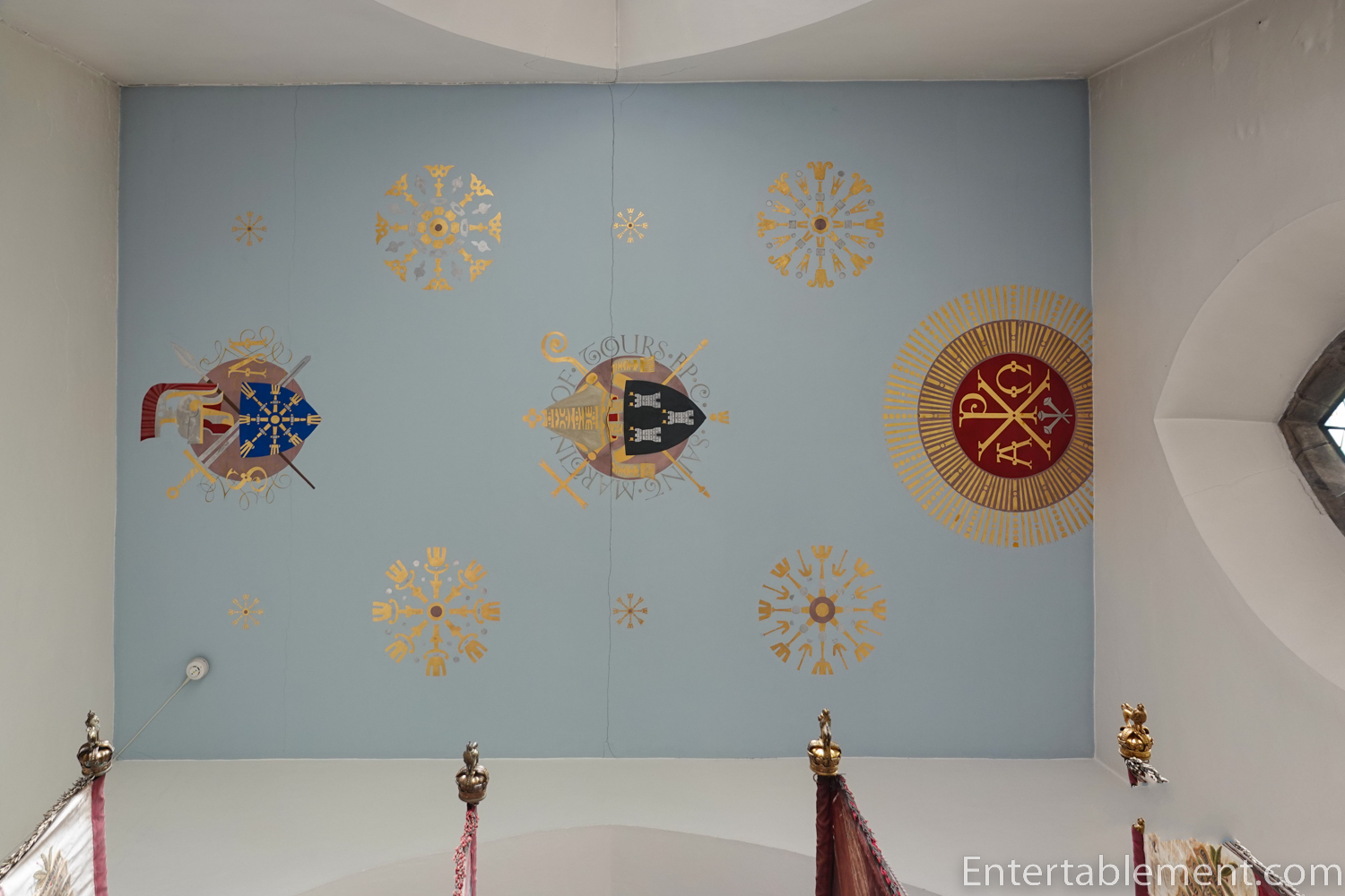 Let’s go outside and take another look. The lantern was clad in stone in the late 90s, covering the previous concrete exterior, and it blends in well now. But, stepping back, I can’t help but feel that the lantern wouldn’t be quite as incongruous were it not for the space-age spike topped with a tiny cross.