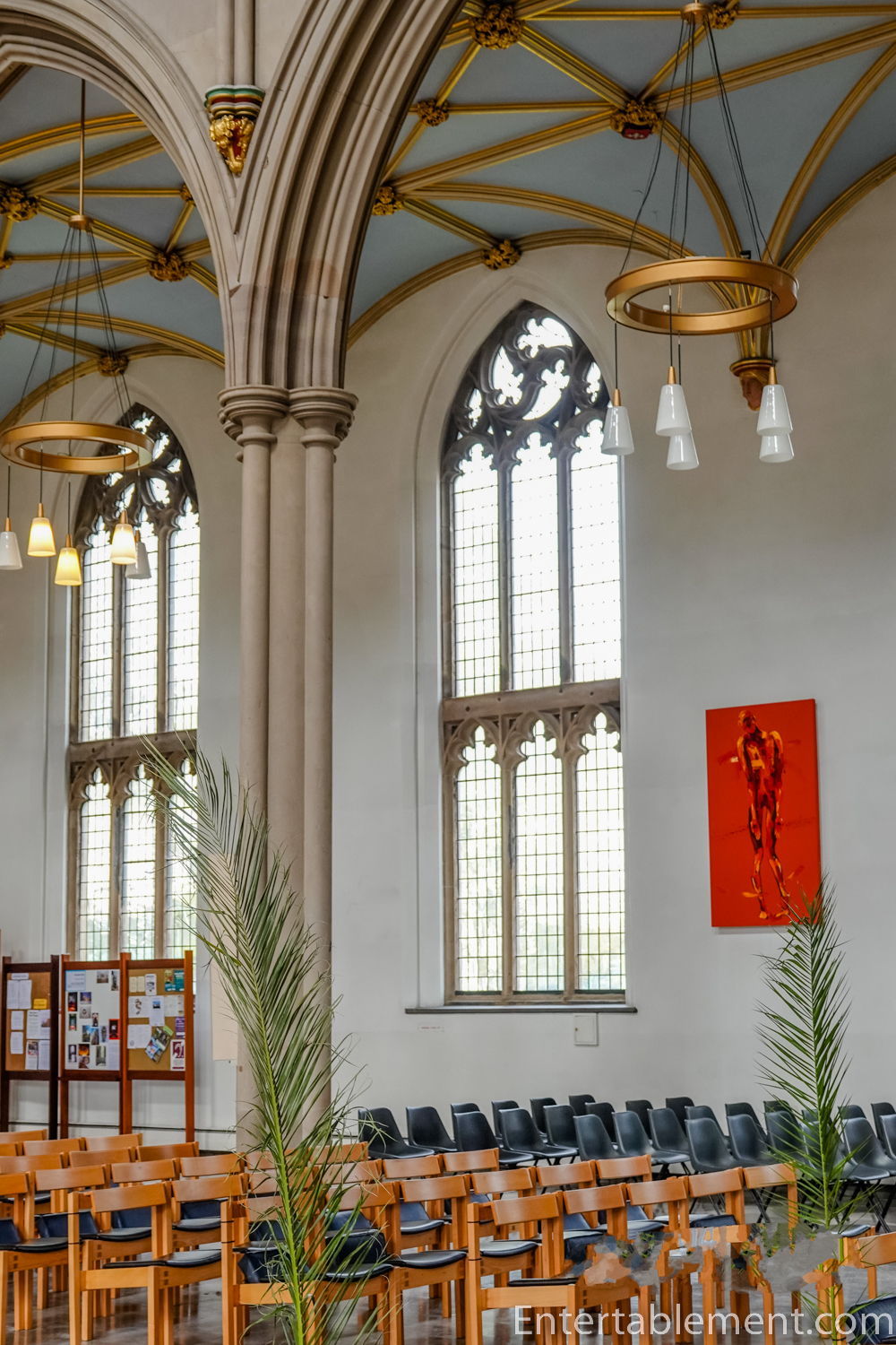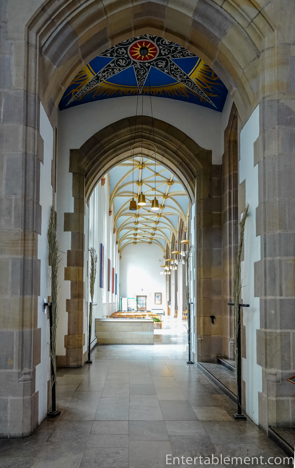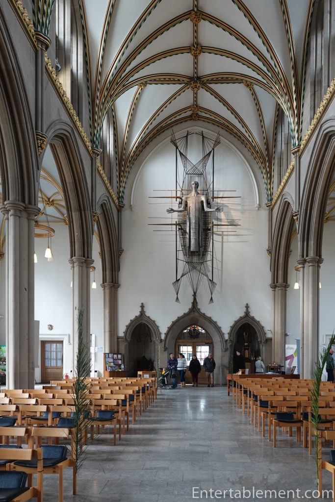 “… the striking Corona, both a crown of suffering and a crown of glory… our eyes are taken upwards by the intentionally thick cables to the central boss of the Lantern Tower depicting the Holy Spirit. “