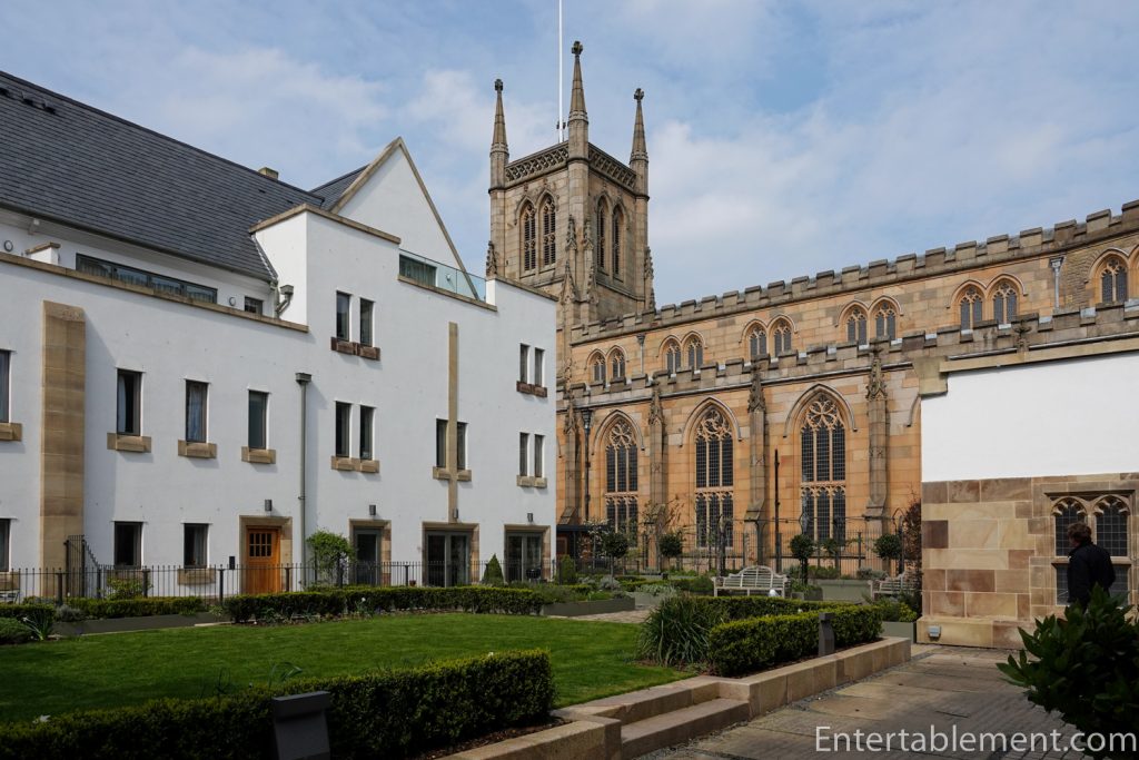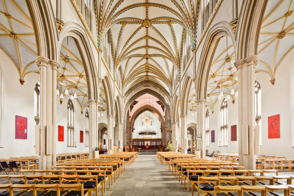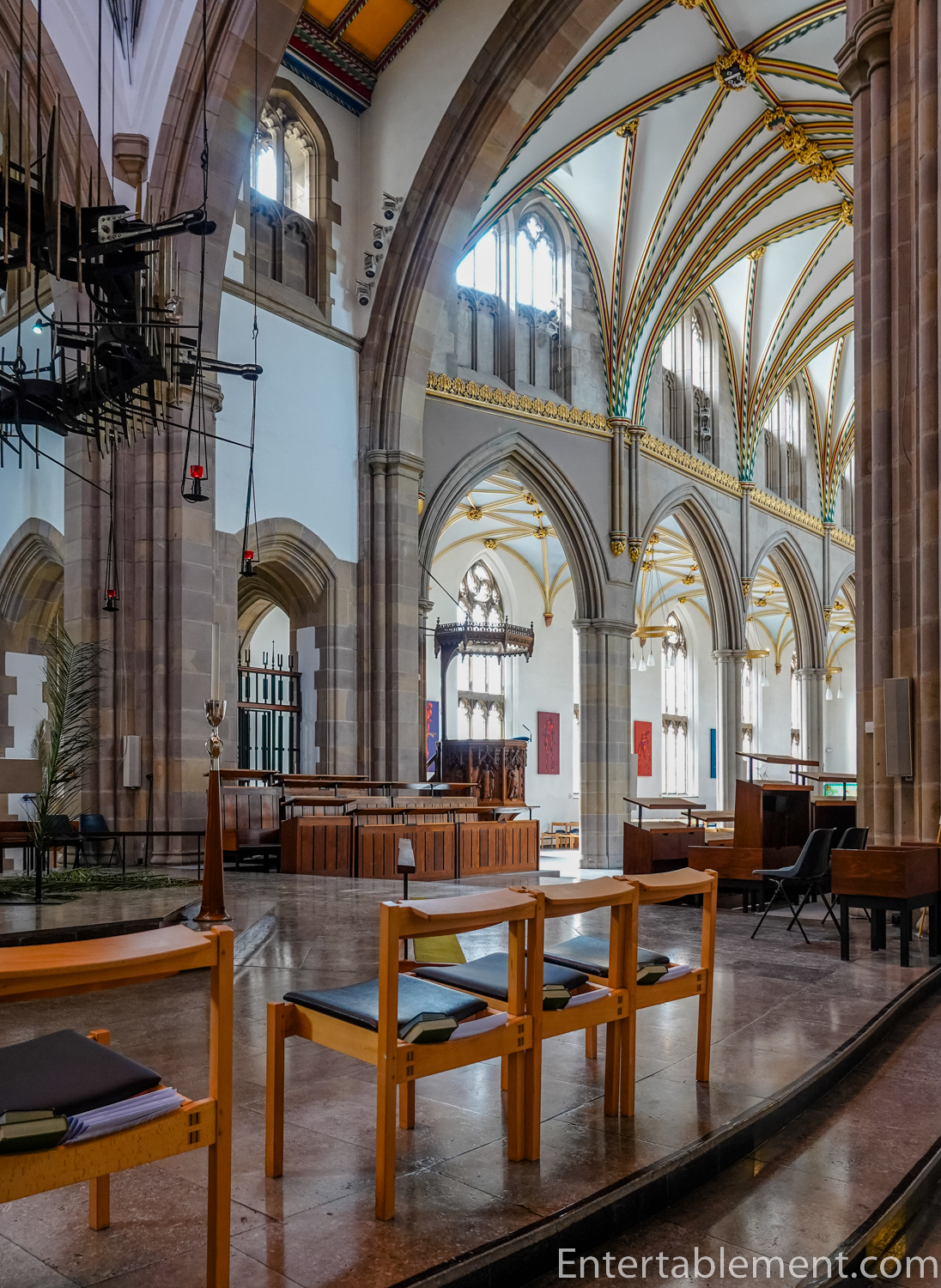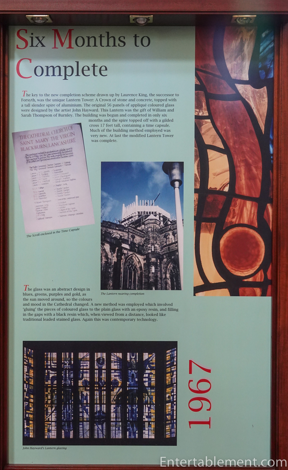 “… the striking Corona, both a crown of suffering and a crown of glory… our eyes are taken upwards by the intentionally thick cables to the central boss of the Lantern Tower depicting the Holy Spirit. “