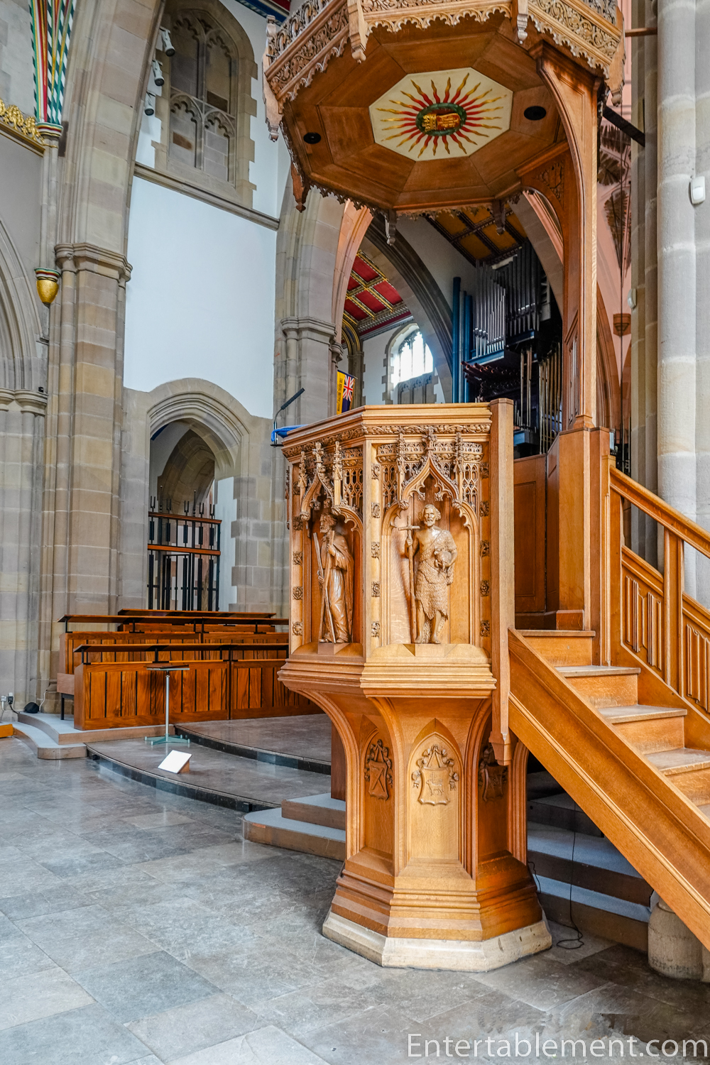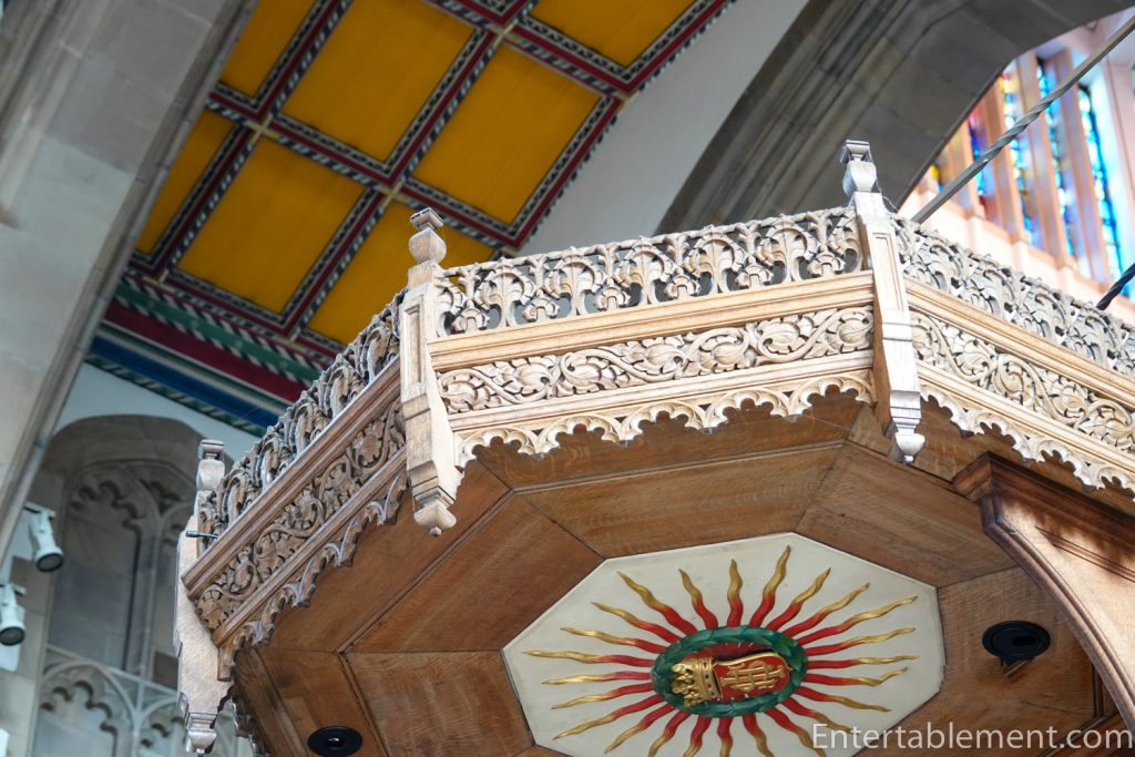 The pulpit has an old-fashioned canopy, which was an early method of amplifying sound.