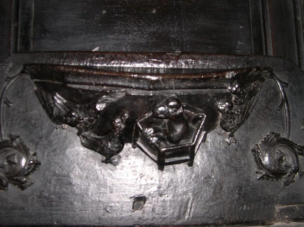 This one is a little hard to see, but it’s a fox in the pulpit preaching to geese, a common satirical theme from the medieval era.