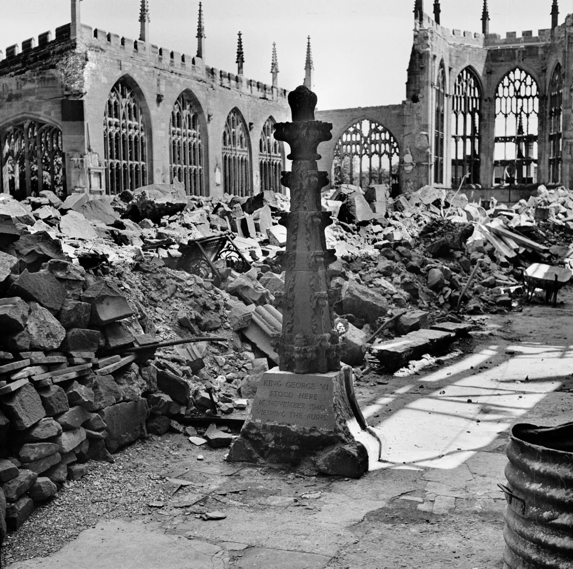 Images of the destruction shocked the British public, but Reverend Howard was determined not to encourage calls for revenge. Jock Forbes, St Michael’s stonemason, tied two charred beams into a cross and placed it near the ruined altar. The words “Father, forgive” were written close by on the walls.