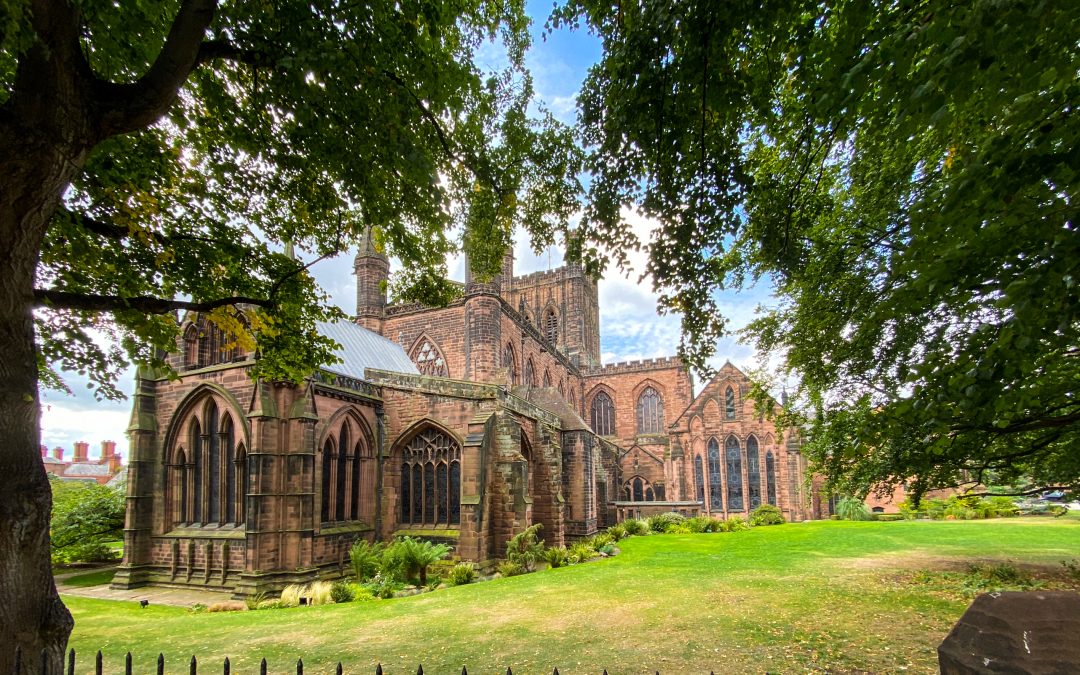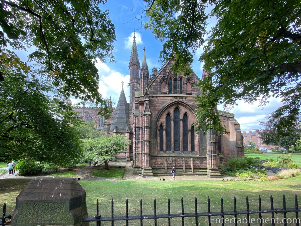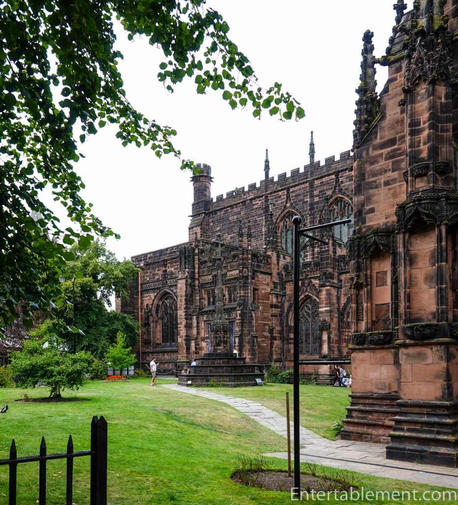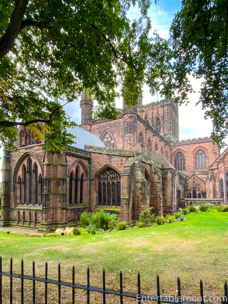 Chester Cathedral’s grounds tuck up against the wall around the city, with generous green space.