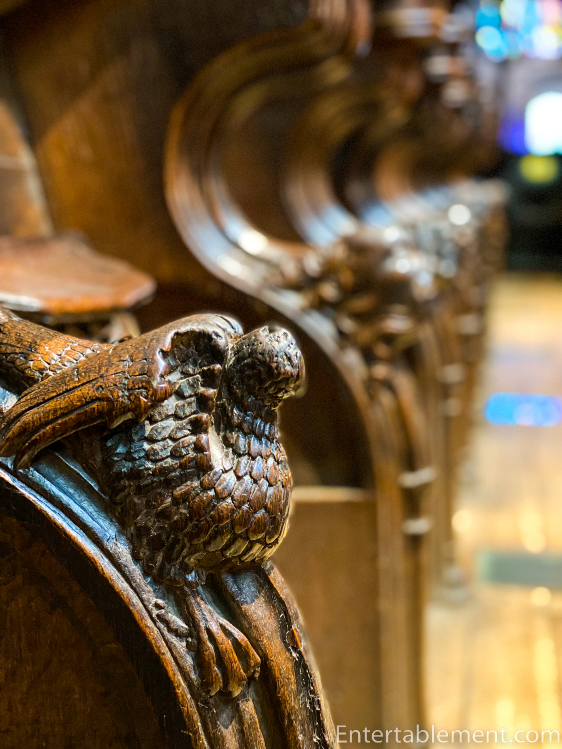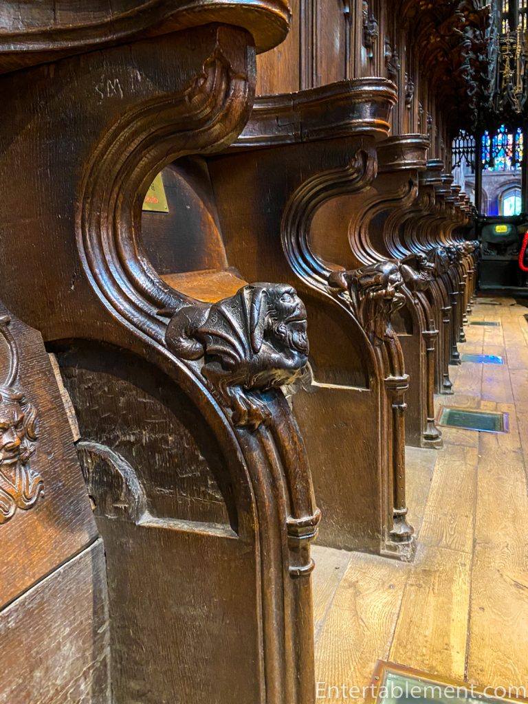 The choir stalls, with their intricate canopies, are from 1380. The detailed carvings on the end of each pew are called poppyheads (a new word for me while researching this Cathedral).