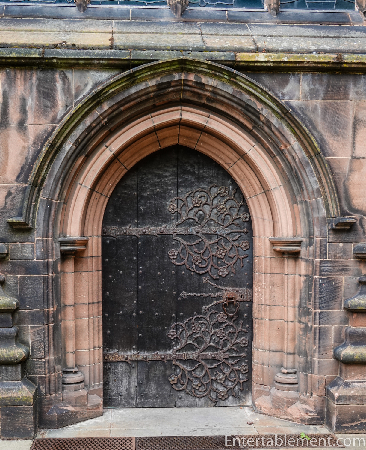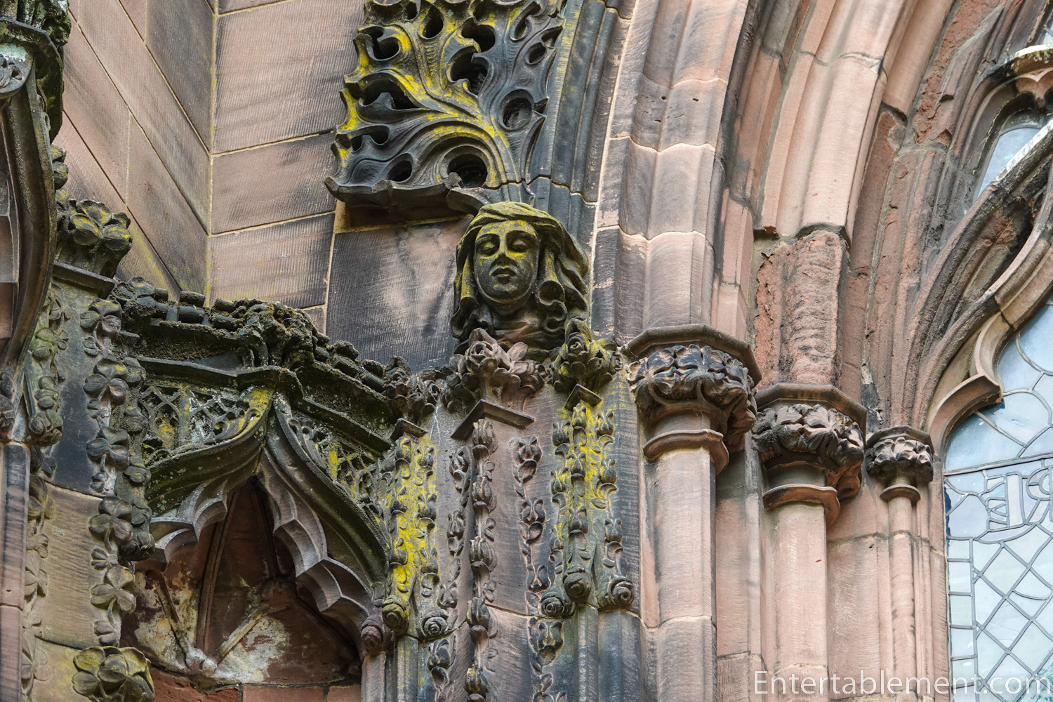 Like the Carlisle, Lichfield and Worcester Cathedrals, Chester is made of red sandstone, friable, easily eroded, and badly affected by pollution. By the 19th century, extensive restorations to the exterior were required. Enter the ubiquitous George Gilbert Scott; he set to with vigour, with more than the usual grumbling from the cheap seats I gather. Rival Liverpudlian architect Samuel Huggins was a proponent of the Classic style. This is all very well, but the Chester Cathedral, neglected and in perilous condition, was originally Norman and then predominantly Gothic. Not a whiff of Classic in sight. Huggins, who had not been hired to work on the Cathedral, objected to Scott’s plans and published a not-so-subtly titled paper, On so-called restorations of our cathedral and abbey churches. Cheap seats and cheap shots. The exterior we see today owes a great deal to Scott’s work; practically the entire Cathedral was re-clad in new sandstone, the existing stone being heavily damaged through weather and Industrial Revolution pollution.