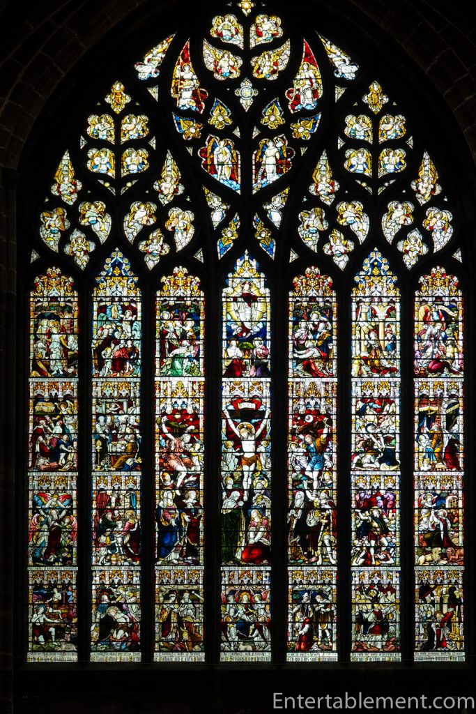 The original architecture is Perpendicular Gothic, exemplified by the flowing tracery in the upper portion of the stained glass window and the thin lancets forming the lower part.