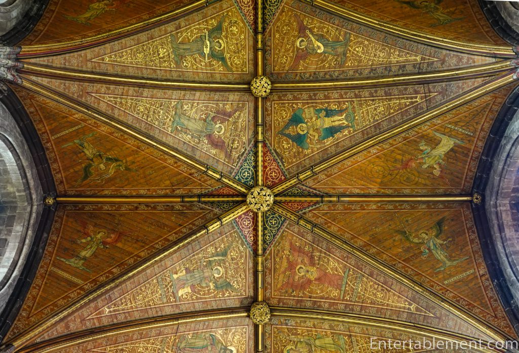 The choir roof vault is made of oak, installed by George Gilbert Scott, and decorated by Clayton and Bell, with the very involved  Bishop Howson directing the iconography.