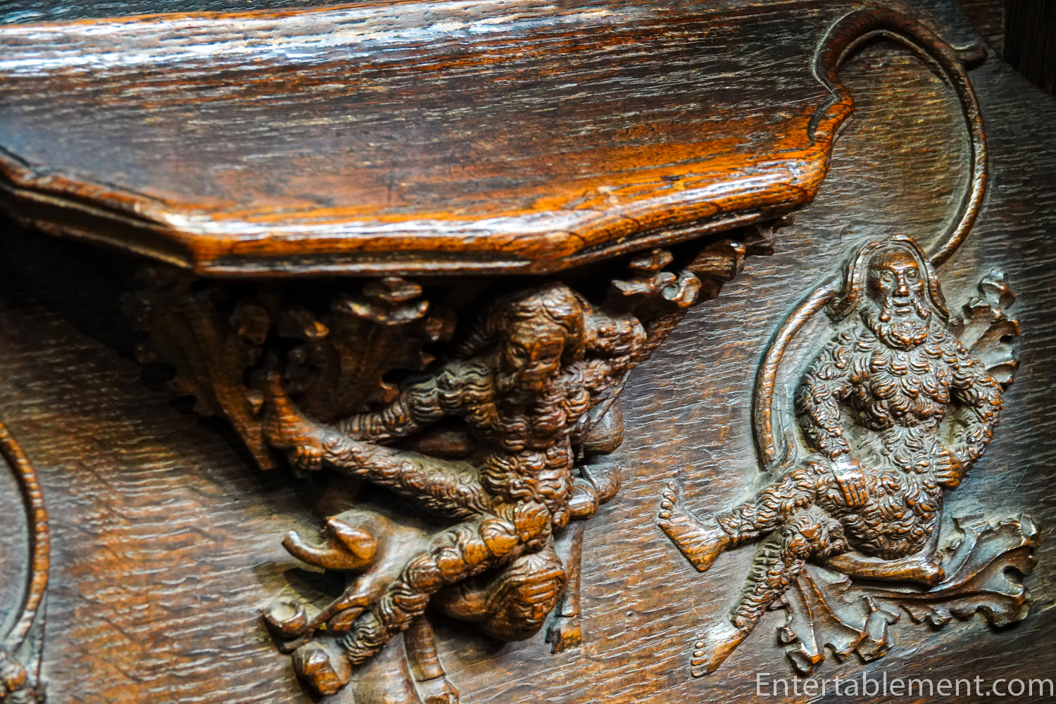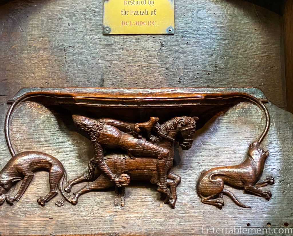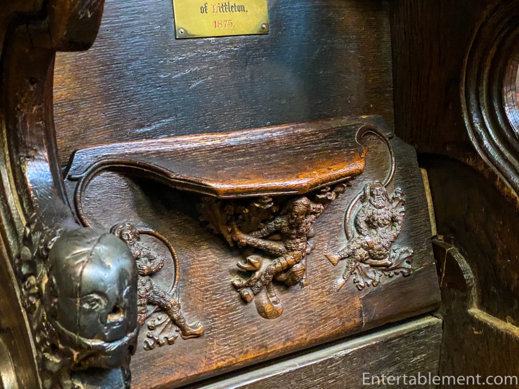 Some substantial carvings are present on some of the pews’ ends, including this slumbering hunter.