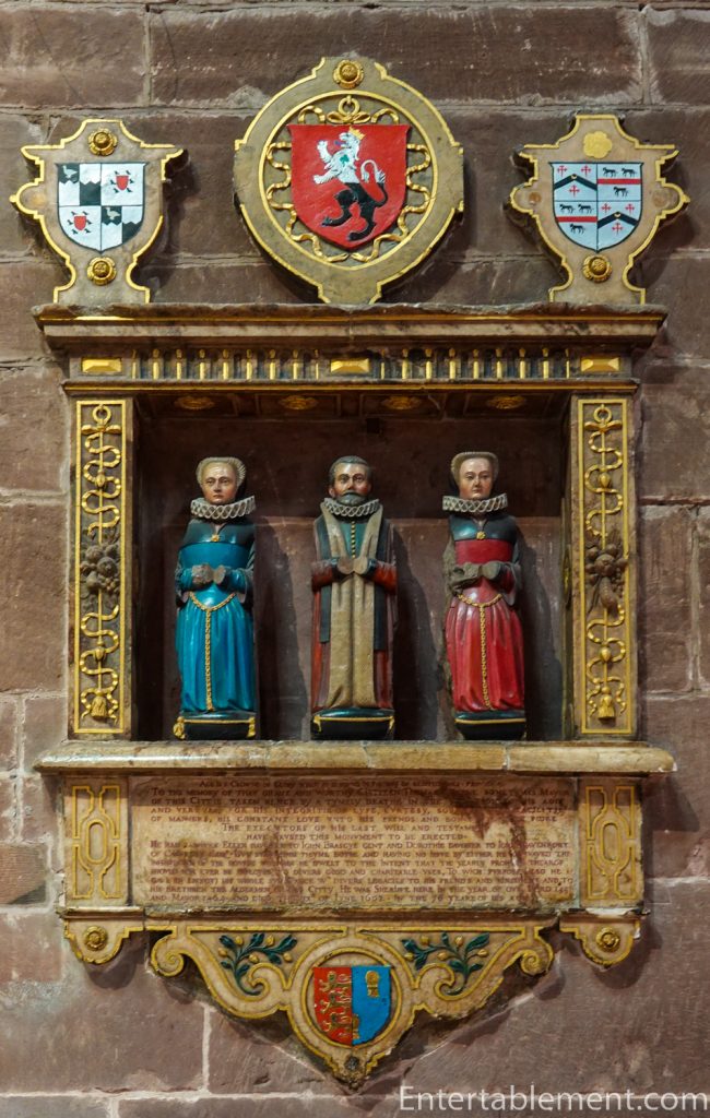 Between the South Transept and the Crossing, we have a 1602 memorial to  Thomas Greene, Sheriff of Chester (1551) and mayor (1569), with his two wives, both of whom he outlived. Note the missing hands. Originally clasped in prayer, they were whacked off by parliamentarian iconoclasts. A bit weird, given they usually went for the faces, but apparently, hands clasped in prayer set off this particular group of wreckers.