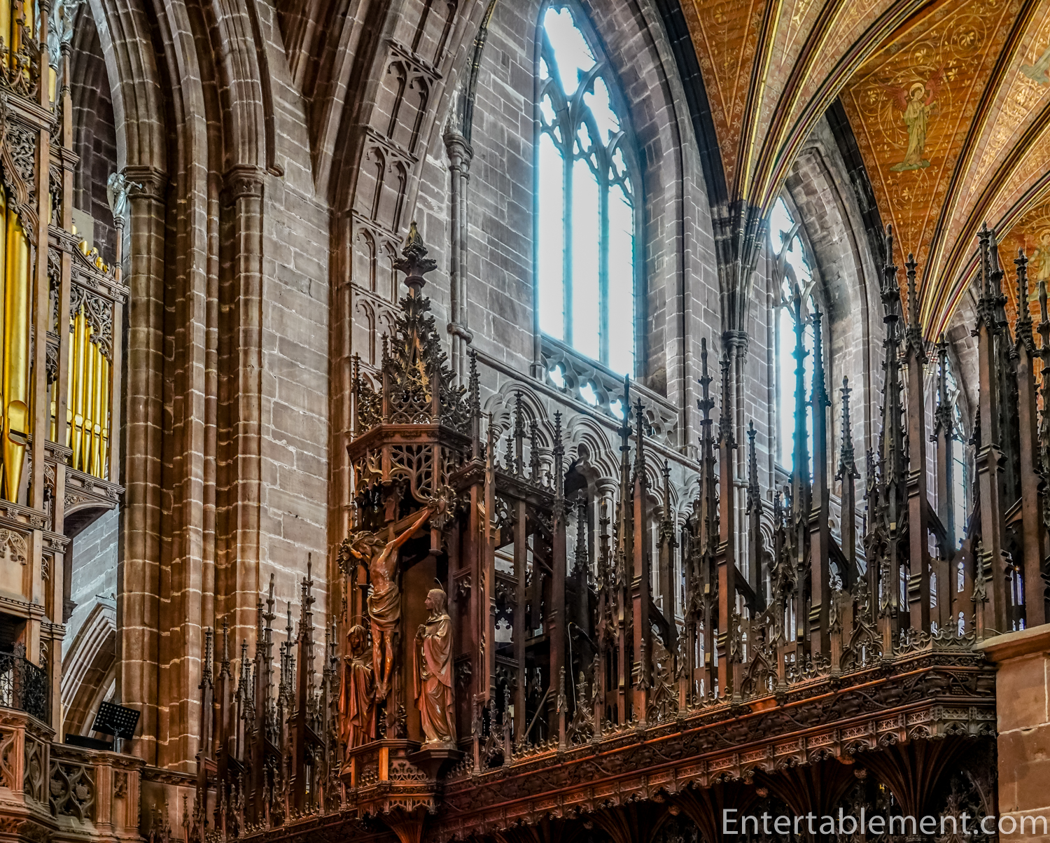 Let’s keep walking east and see the 19th-century  rood screen with a glimpse of the choir stalls’ canopy beyond.