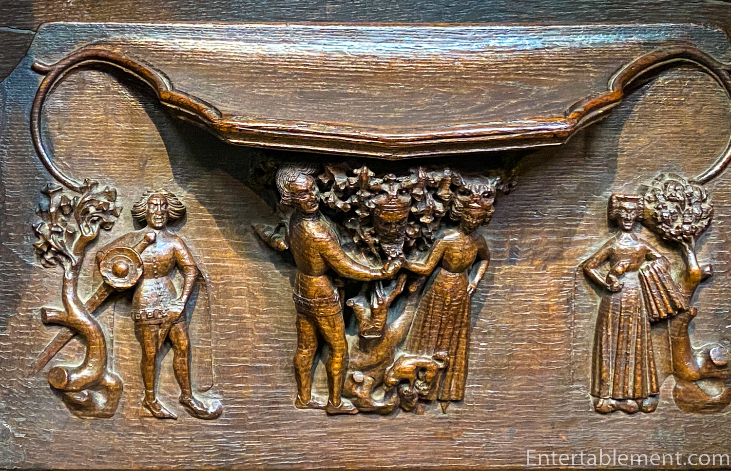 I’ve discovered a marvellous resource, www.misericords.co.uk, for identifying the misericord carvings and their meaning. I thought this one was a jester, but it’s a wodehouse (the wild man of the forest) sitting on a man; the supporters (the figures to the left and right) are also wodehouse(s). What I thought was a jester’s cap on the fellow to the right is just his wild hair. And yes, now I can see the face of the man upon which the central wodehouse is sitting.
