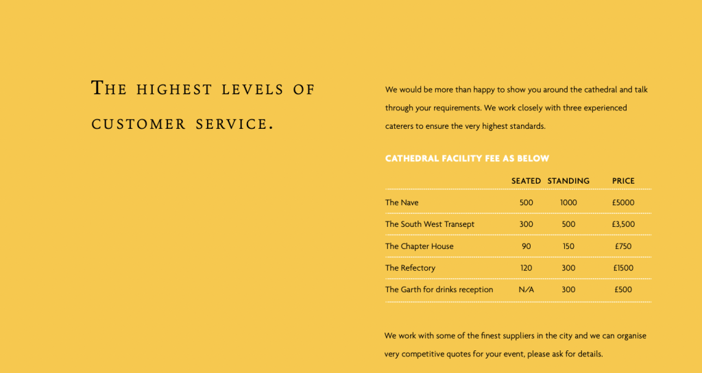 Many of the main spaces of the Cathedral are available to rent for events. This is another example of a Cathedral that is moving with the times and diversifying its revenue stream. Further evidence of the size of the South Transept is the pricing of its rental—at £3500, it’s not much less than the Nave at £5000. The Chapter House, Refectory and The Garth (the garden enclosed by the cloisters) all come in well south of £1000.