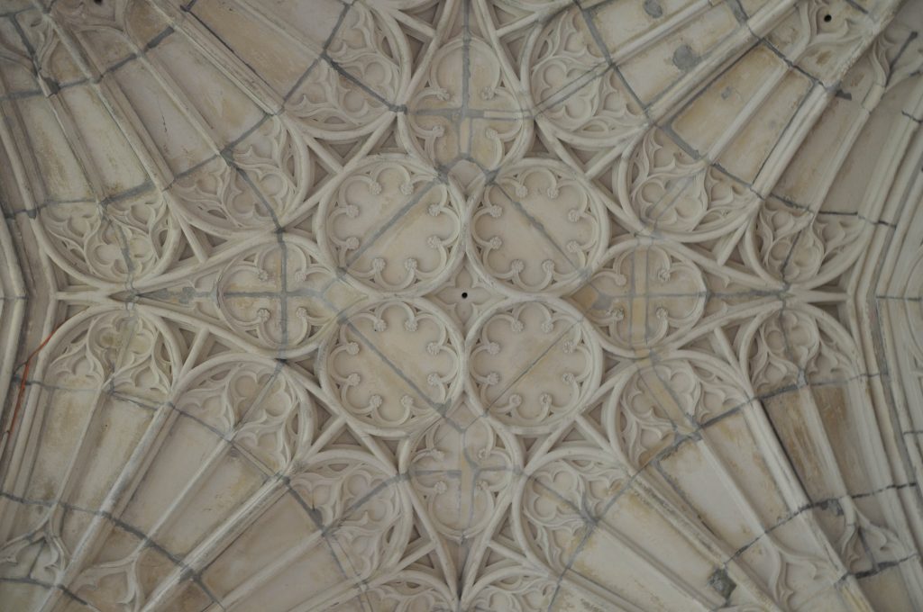 Fan vaulting was added between the 1350s and 1390 in the new English Perpendicular Gothic architectural style when the panels that had already covered the walls and windows were extended up to the ceiling to meet each other overhead.