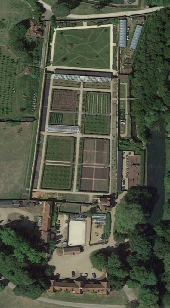 Large country houses of a bygone era invariably had a huge kitchen garden to feed the household. There were no takeaway meals or Deliveroo in those days! An aerial shot of the kitchen gardens at Audley End, which we visited in the spring, gives you some sense of the scale. The central walled garden alone is over two acres; the entire complex covers almost ten acres within its red brick perimeter walls.