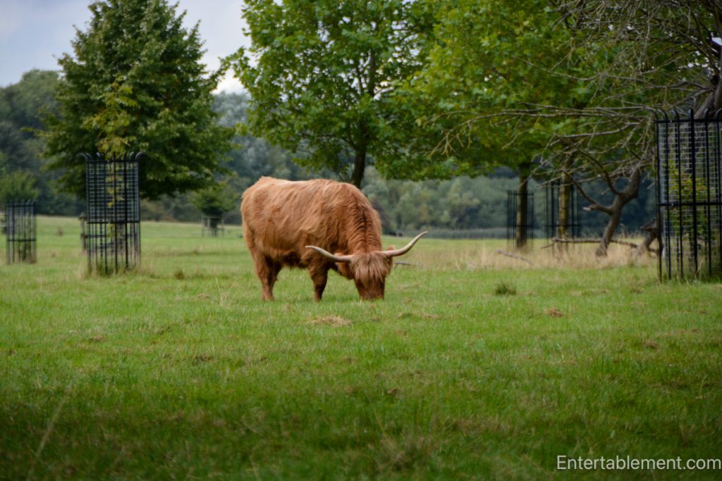 Highland Cows (called “coos” in Scotland) graze around the property.