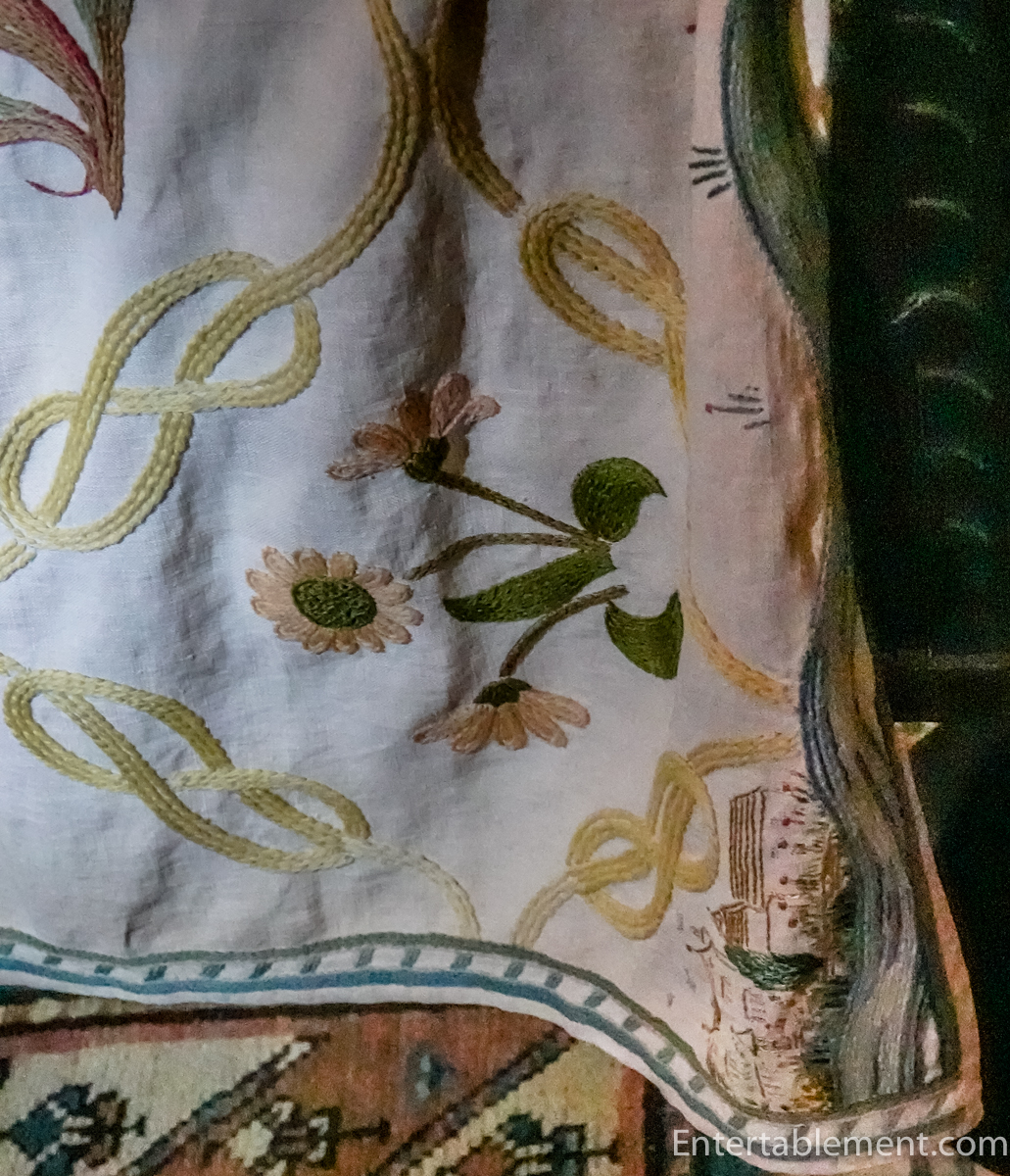 The bed coverings are a work of art. Notice the incredible detail on the hem.