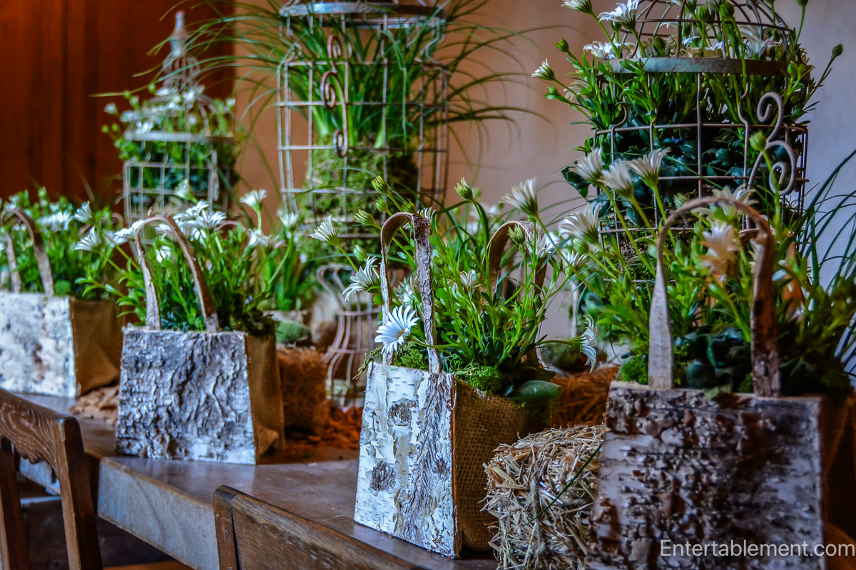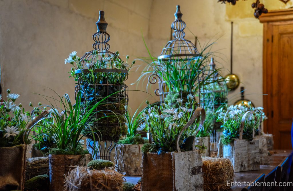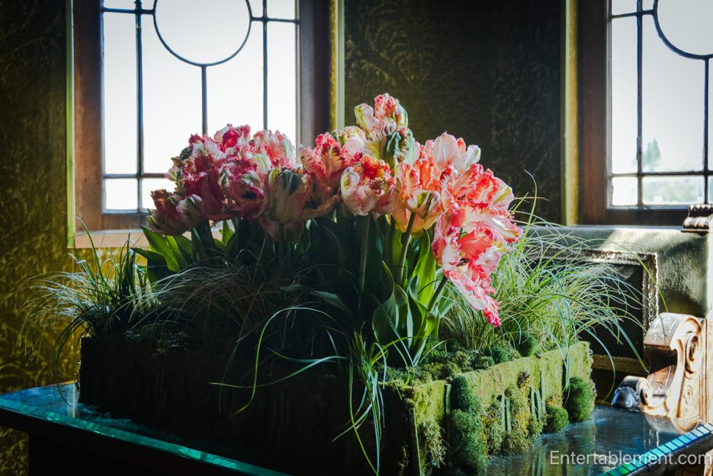 Elaborate seasonal arrangements fill rooms with colour and fragrance. Parrot tulips, moss, and wild grasses spill from bark-covered containers and antique urns.