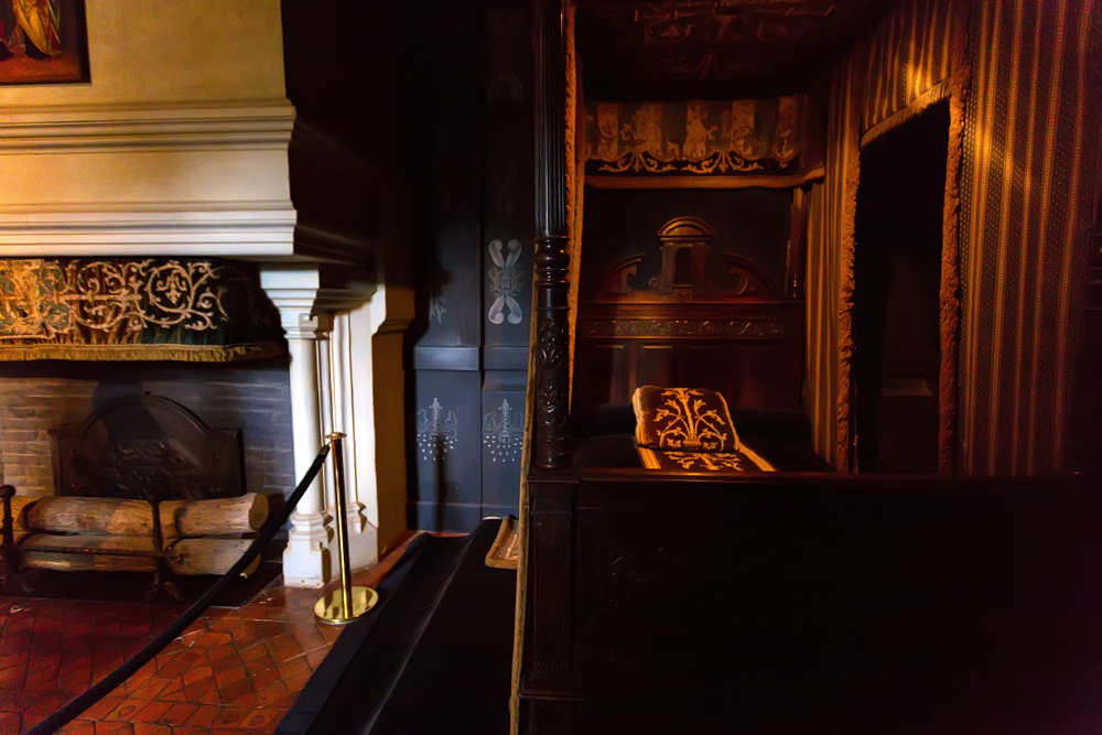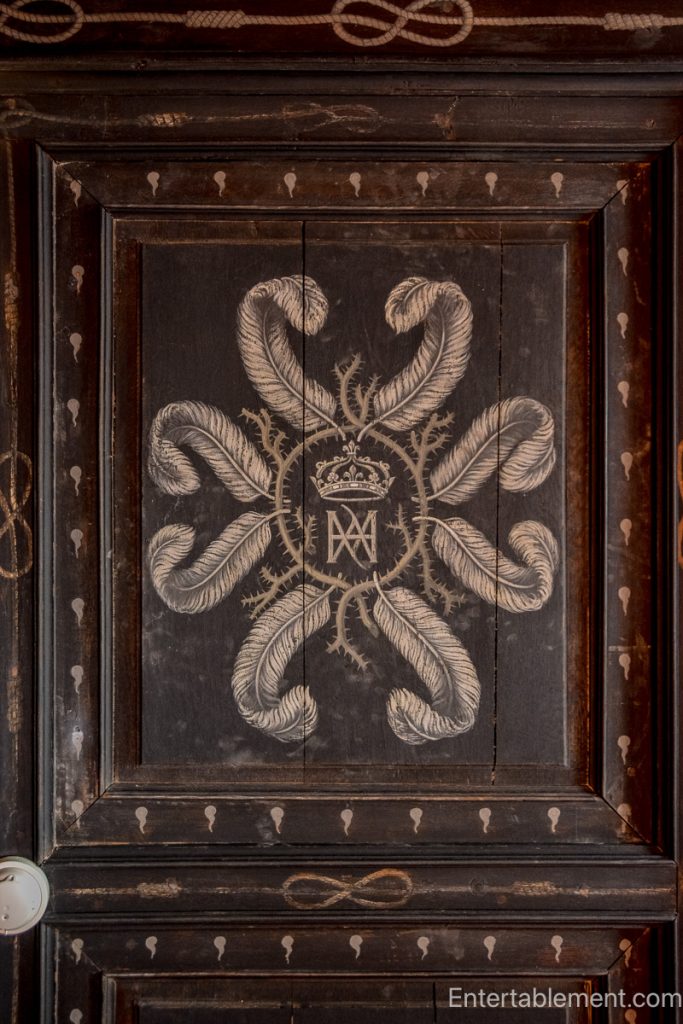 The panel to the left of the bed shows the crowned monogram “MA” surrounded by feathers and thorns, symbolizing sorrow. Crowns of thorns and the intertwined Greek letter lambda reflect Louise’s prolonged mourning after the king’s assassination. Her deeply personal iconography transformed her rooms at Chenonceau into a sanctuary of grief, where she lived in white mourning robes and spiritual contemplation, earning her the title “The White Queen.” A woman of beauty and passion, she remains one of history’s most romantic—and tragic—figures.