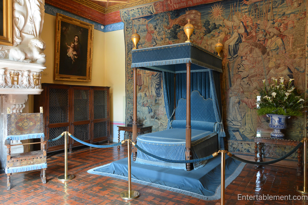 Henry II gifted Château de Chenonceau to Diane de Poitiers, his powerful and elegant mistress. Her taste and influence are reflected in the château’s architecture and décor. The blue bedroom, often associated with her, radiates restrained sophistication, featuring dark panelling, subtle detailing, and rich sapphire tones. It contrasts the theatricality of Catherine de Medici’s additions, and remains a testament to Diane’s enduring presence at Chenonceau—even after Catherine reclaimed the château following Henry’s death.