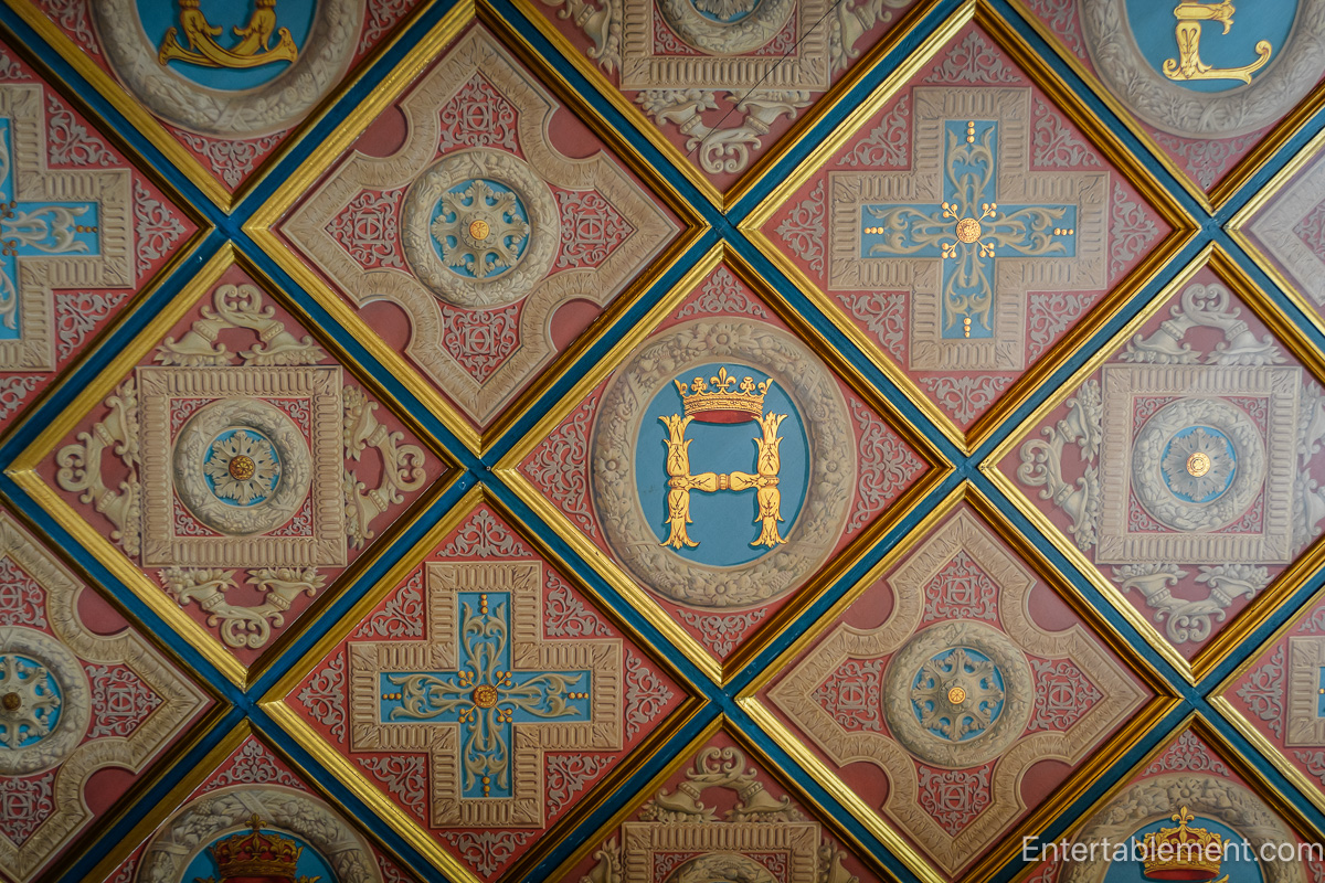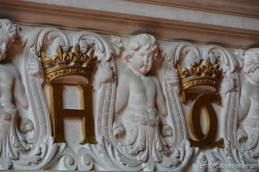 Though the “blue room” was used by Diane de Poitiers, it must have been a bit galling for her to see the initials of her rival, Queen Catherine de Medici, emblazoned on the fireplace.