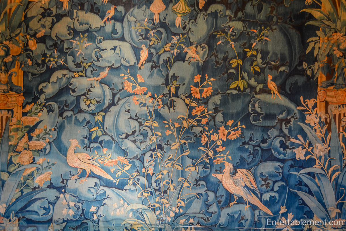 Another delight: the floral-and-bird tapestry in soft blue and rose tones.