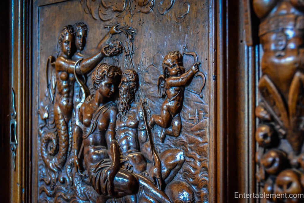 Details abound: mythological wood panels where cherubs draw bows and sea creatures cavort…