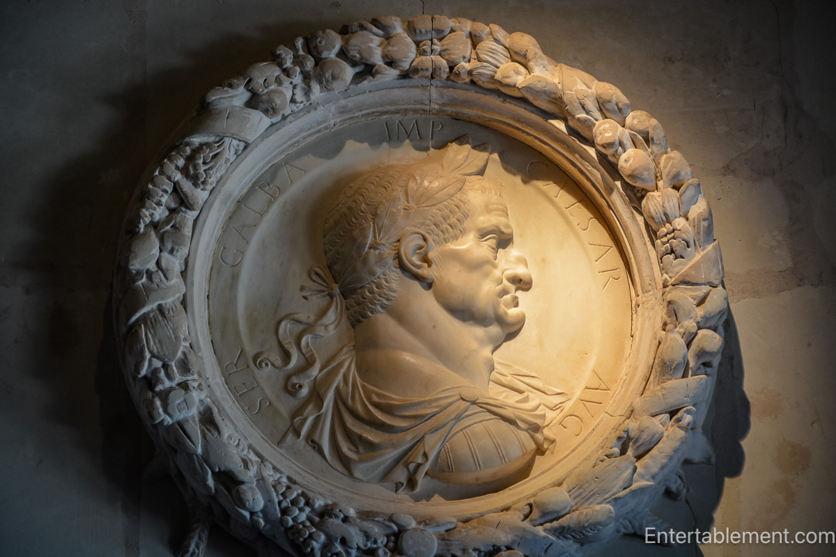 A marble medallion of Roman Emperor Galba watches from the wall with imperial solemnity.