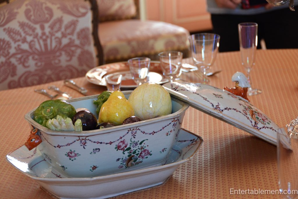 The table is dressed with silver candelabras, etched glass, and a particularly playful addition—a tureen filled with colourful porcelain fruit and vegetables.