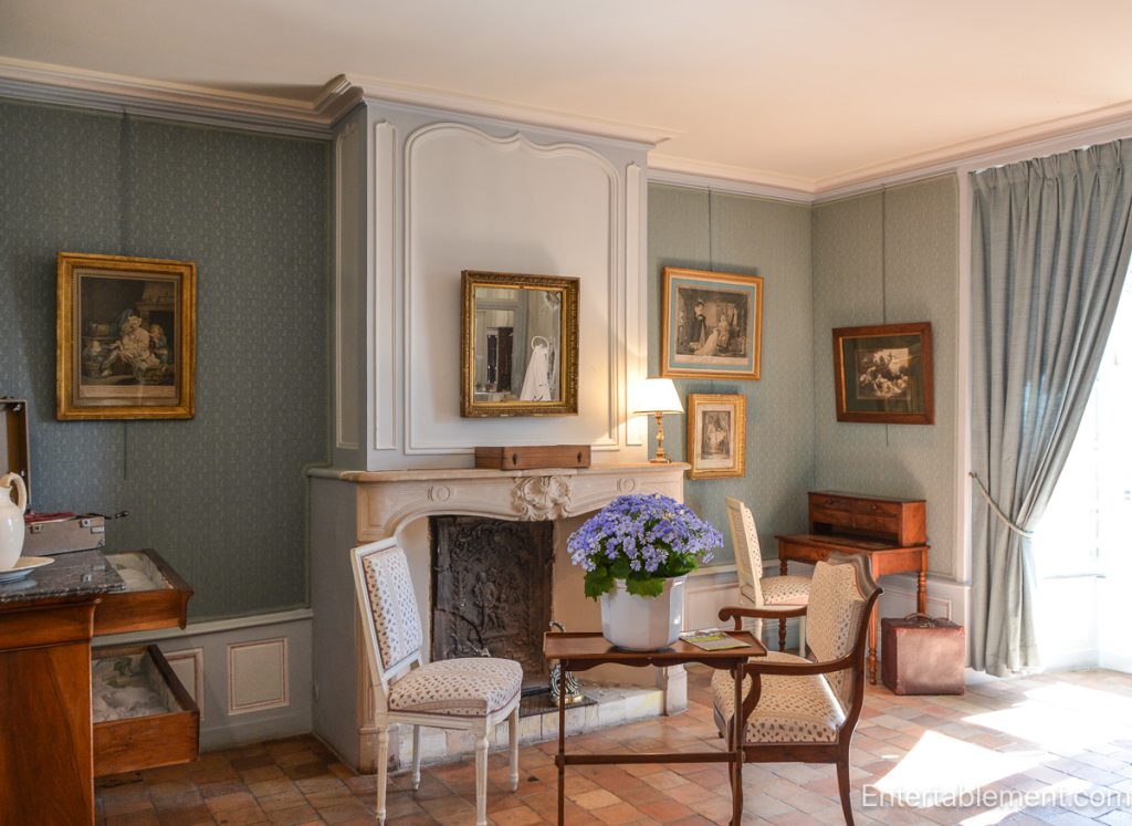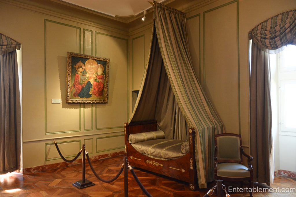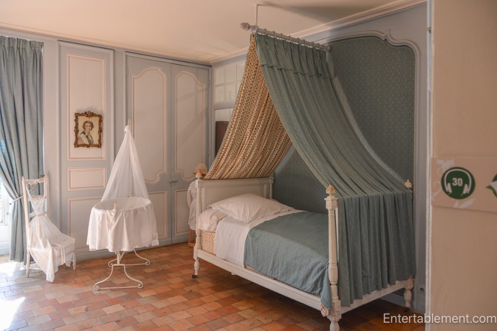 Villandry’s Empire-style room has a Lit à la Duchesse, a bed with a canopy supported at the head and no foot posts. Many beds were shorter, not because people were shorter, but because they slept upright or semi-reclined, a position thought healthier (especially for digestion and preventing illness). Curtains also helped trap warmth and keep out insects.