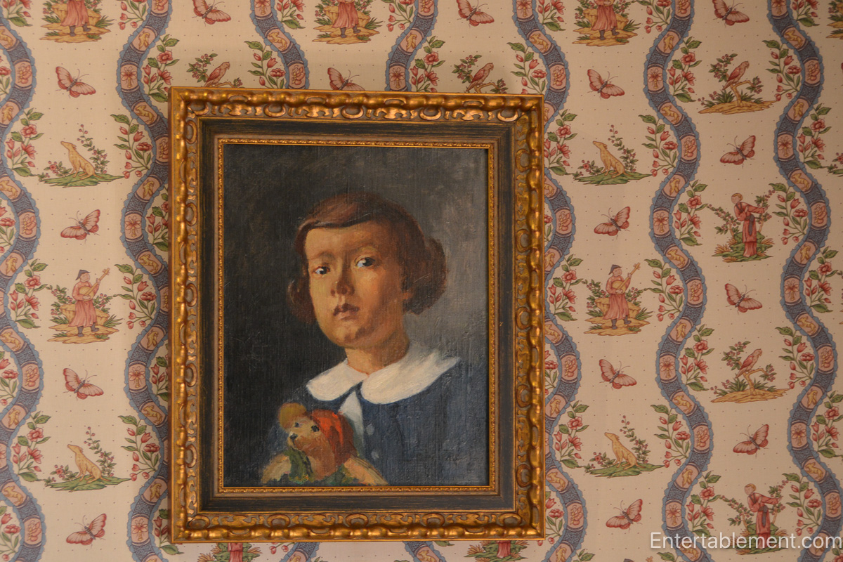 The portrait of a boy with a teddy bear, framed against whimsical wallpaper of butterflies and rural figures, evokes a childlike world blending innocence with imagination.
