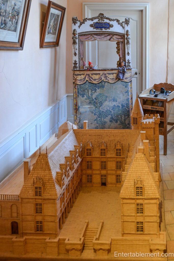 Speaking of theatre, I was intrigued by this model of Villandry in one of the upstairs rooms. It gives a good visual sense of the château’s overall proportions. At first, I thought the object behind it was a sedan chair, but then I realized it was a puppet theatre.