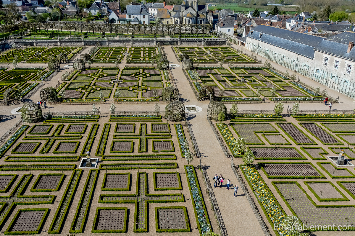 From above, the full impact of Villandry’s layout is clear. Terraced views reveal the strict axial alignments and repeated motifs that govern the overall design. Walkways divide each parterre with mathematical precision, echoing architectural principles and enhancing the sense of control over nature, a central theme in Renaissance landscape design.