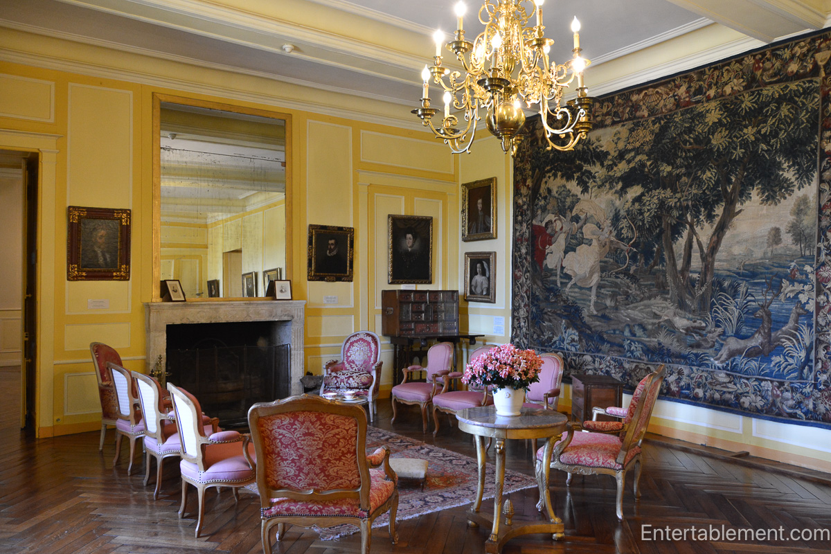 Today, the formal rooms reflect this elegant layering. The grand salon is cheerful, with butter-yellow panelled walls and a tapestry depicting a mythological hunt, which seems to bring the outdoors in. Gilded mirrors share space with vases of tulips, while a circular arrangement of chairs surrounds a Louis XV fireplace.